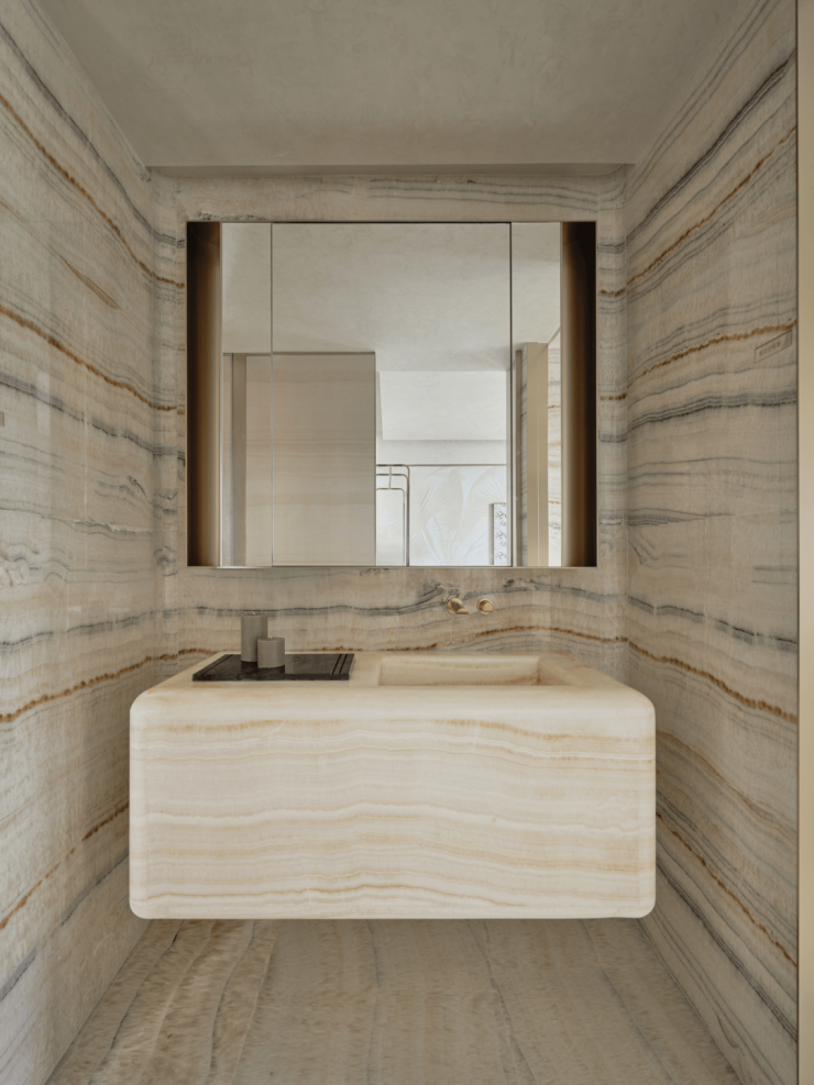 清水玉地面贯穿室内空间,半吨重白玉洗手台整体打磨,使其呈现出淡雅的色泽和岁月的润泽。