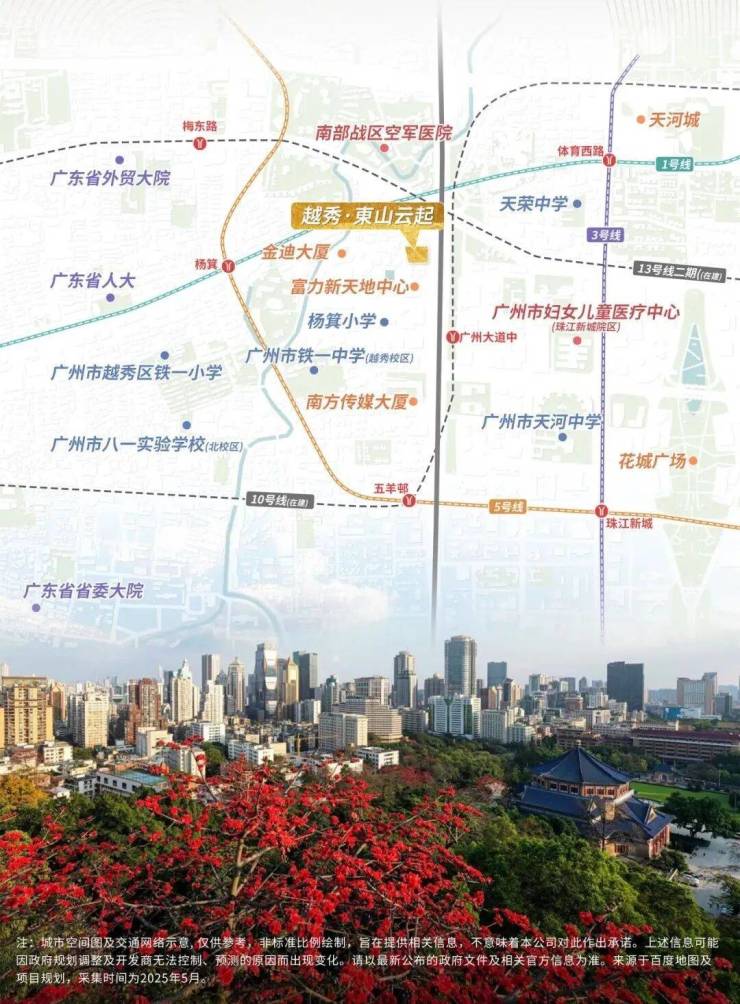 所以,全新新规项目越秀·東山云起的亮相,堪称“世纪联姻”——从地图上看,東山云起与天河一路之隔,集齐了广州政教文中心+城市中轴+珠江新城三大buff。