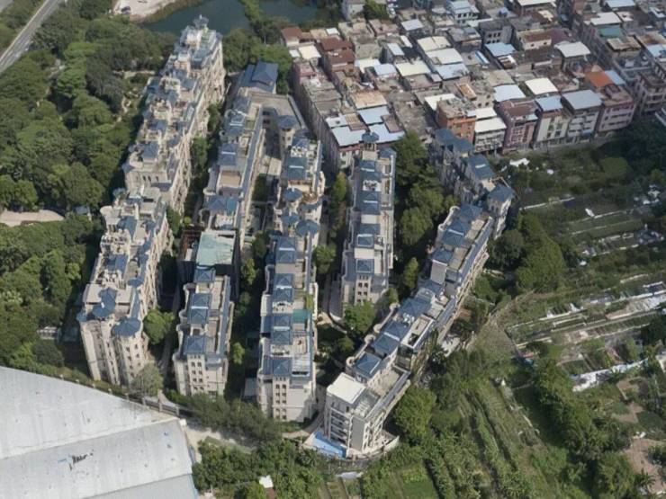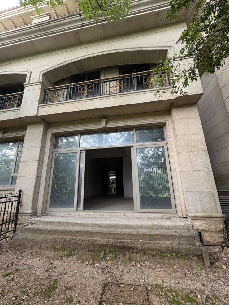 琶洲壹号仅容纳了47户联排别墅,建筑为欧式古堡风格,均为毛坯交付,外立面采用干挂石材,蓝色西瓦坡形屋顶,每栋都是独门独户双院,擎天罗马柱,门庭瞩目,门头上设置族徽位,入户大门是“缅甸柚木”全实木制作的双开门,颇具名门大家风范。
