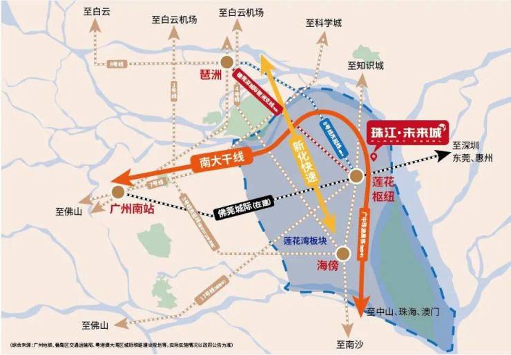 未来,不仅可以实现3站到琶洲CBD、万博CBD,4站到南站(佛莞城轨、穗莞深城轨琶洲支线),触角延伸到佛山、东莞和深圳,带领莲花湾向广州主城,乃至湾区各地进发