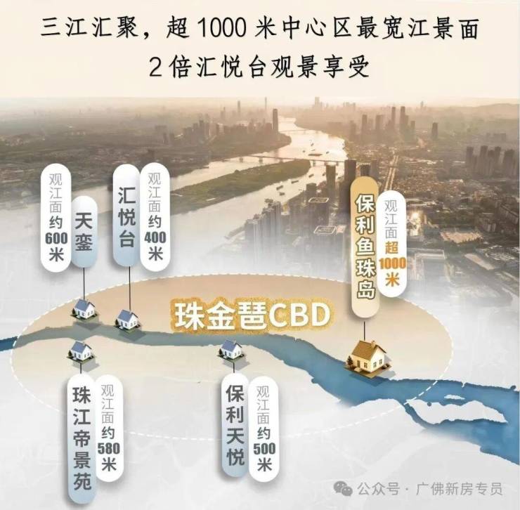 珠金琶史诗级同框,一眼望尽三十年(全画幅、长纵深的天际线江景)第一次买江景房的人,有江就行。真正的江景藏家,选的是江景的面宽和纵深和背后的故事感。对比广州顶级江景豪宅,汇悦台观江面约 400 米、保利天悦约 600 米,而保利鱼珠岛江景面超 800 米(最宽 1000 米),宽度约为汇悦台的 2 倍,远超同类顶豪。