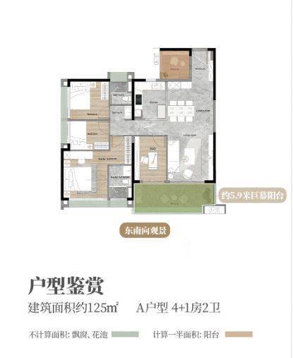 越秀・天悦云山府在户型设计上独具匠心,建面约 90 - 160㎡的三至五房,满足不同家庭阶段的需求。整体建筑楼栋东南倾斜 45°,只为让您拥有最佳的瞰山视角和采光通风,每一口呼吸都饱含着白云山的清新鲜氧。160㎡五房三卫户型,南北通透双阳台设计,瞰景阳台约 6.9 米,五开间朝南,主卧带独立衣帽间,尽显奢华大气。产品装修标准对标万博 CBD 的和樾府,全屋配置智能化系统、六大收纳系统、客厅主卧风管机、国际品牌等级交标,为您打造高品质舒适的优越生活。