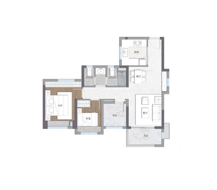 建面约74㎡的2+1户型, 四开间南向采光,进深约1.6米阳台,南北对流