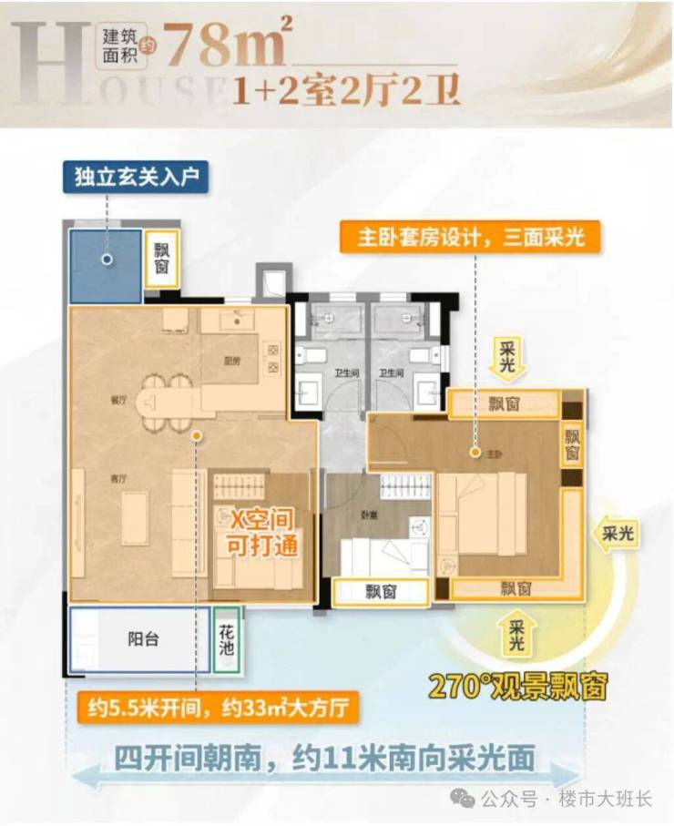 建面78平,南向约11米采光,四开间朝南,独立入户玄关,主卧270度景观飘窗,三面采光,还可做成33平的大客厅