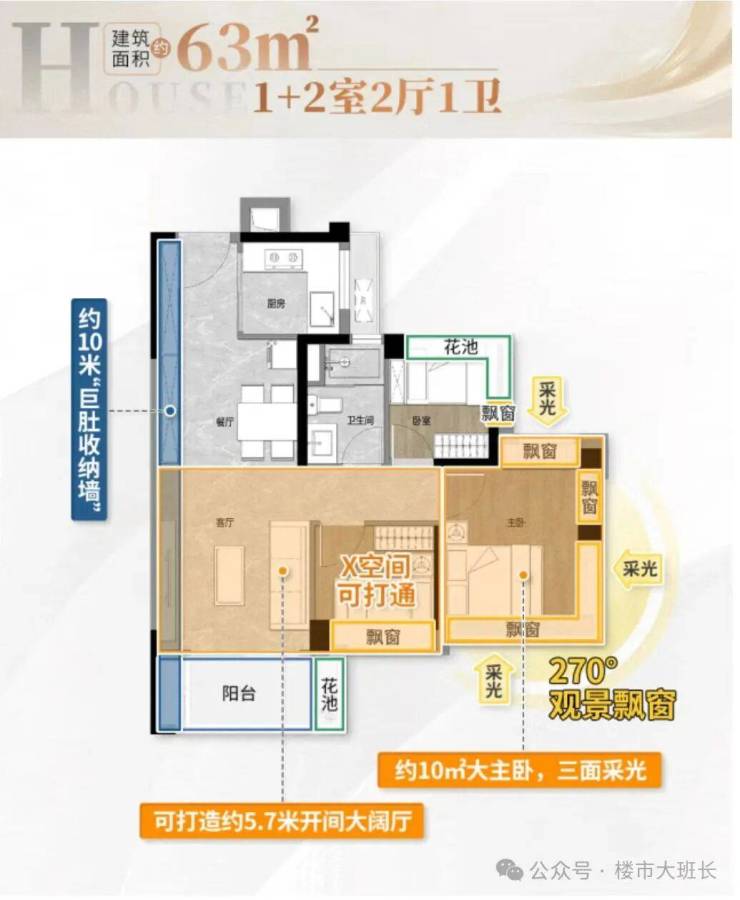 建面63平,传统竖厅户型,约10米的收纳墙,厅出阳台,靠近客厅的次卧可打通做成大方厅,三个270度观景台,使用率超过100%,主卧面积超10平,总价110-125万左右