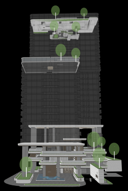 底部架空层4个花园,最高可达约8米,南北塔楼屋顶各1个云端花园,形成六重立体垂直花园,总面积约5630㎡。
