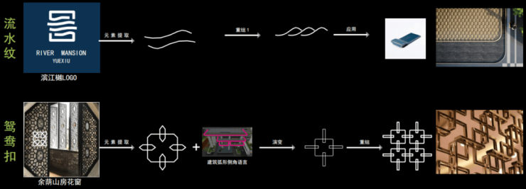 此外,将岭南地域文化融于现代艺术景观造园之中,满眼岭南风情。比如,提取岭南四大古典园林之一余荫山房建筑元素,重组、定制寓意美好的鸳鸯扣。比如,取岭南画派的山水元素,将流水纹样进行提炼,弯弯曲曲,曲曲折折,形成岭南山水意境。
