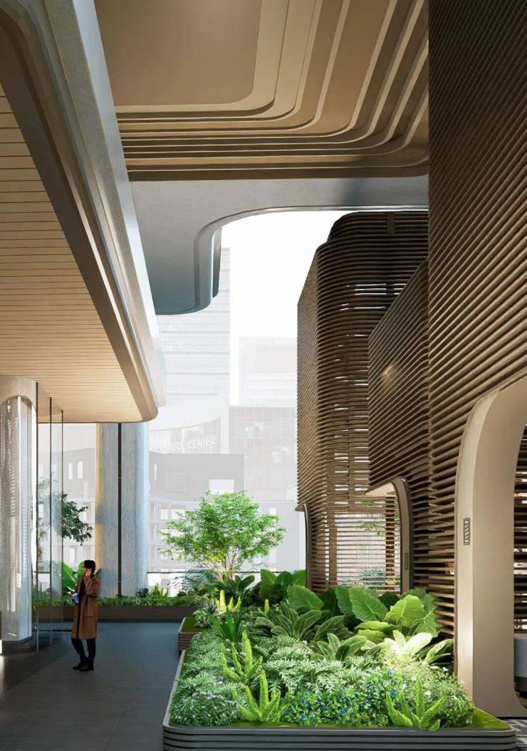 架空设计使得原本独立的建筑与环境产生了对话关系,营造出自然与建筑共融互渗的格局。越秀还想通过空间创造与城市的关系,还空间予城市,为人们开拓一个高舒适度、低密度的新体验空间。