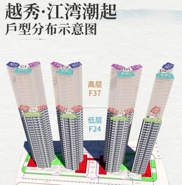 高区为25-37层,两梯三户,有建面约135、160、195平三种户型。