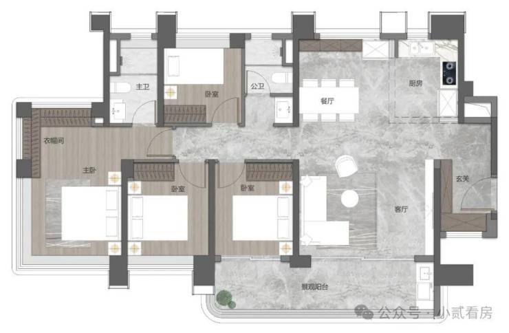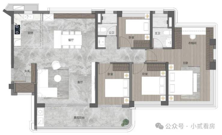 建面95㎡四房,南向看江景,主卧的270°环幕大飘窗,同样能把采光、景观进行了全面放大。
