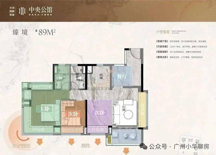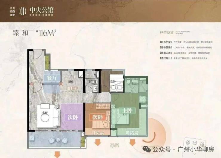 保利招商华发中央公馆采用了围合式设计,6栋47层高塔楼设计,小区自身配建有文化体育场馆和幼儿园,除了2#楼王是两梯四户,其余均为三梯六户,8#是5层高的文化馆,9#是配建3层高的幼儿园。