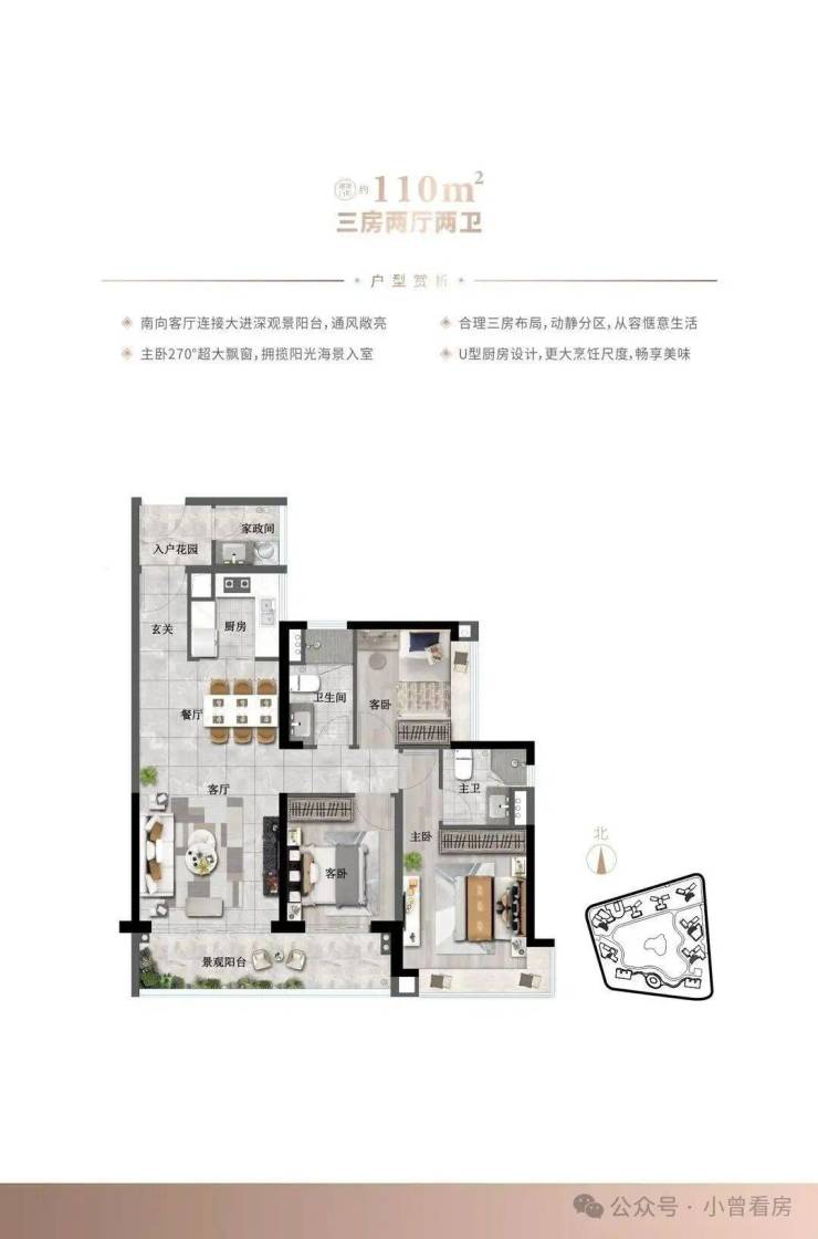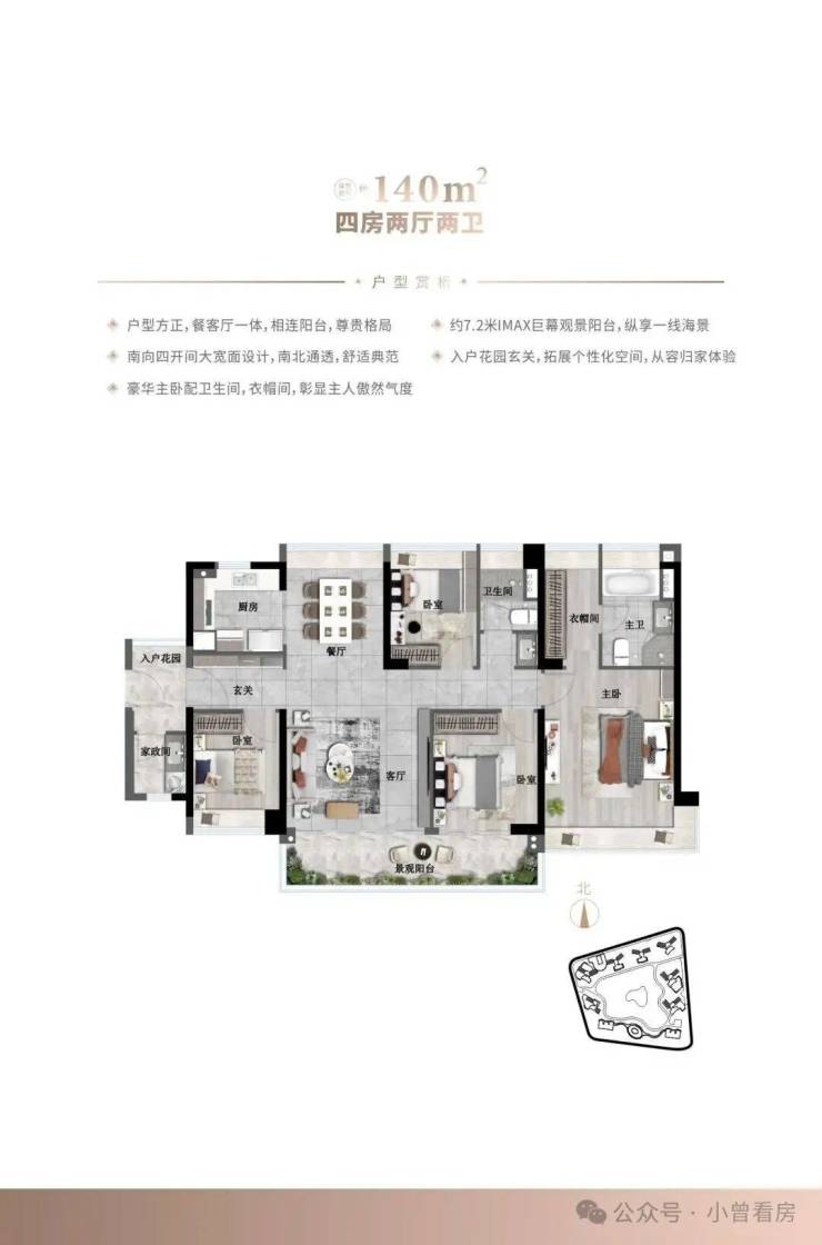 特邀国际豪宅设计专家SHING&PARTNERS汉森伯盛国际设计集团倾力打造,双甲级资质、会长设计单位,独创点式+U型曲线布局,超百米楼间距,最大化景观面;90%户型南向直面大海,视野无界,拥揽一色海天,胸怀壮丽世界。