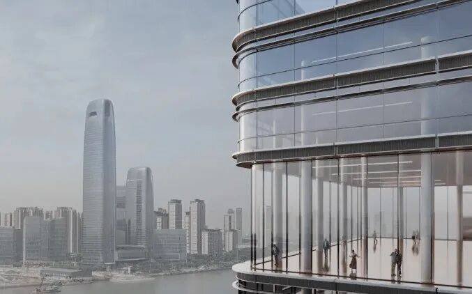 外立面采用木色陶板与全景玻璃幕墙,以“曲水流觞”的涟漪造型呼应珠江文脉,同时融入垂直生态理念,打造空中绿岛与可呼吸的建筑肌理。