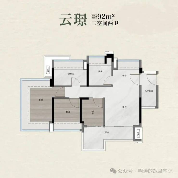 这个户型,同样也是卧室归南,只不过入户玄关位置,和89平户型不太一样。