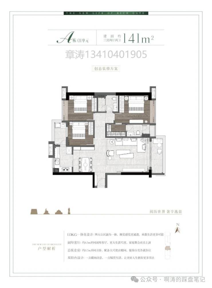 A栋03单元三面采光三阳台139㎡稀缺南向四房户型: