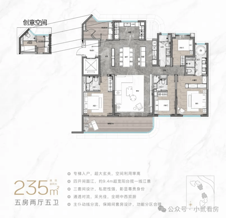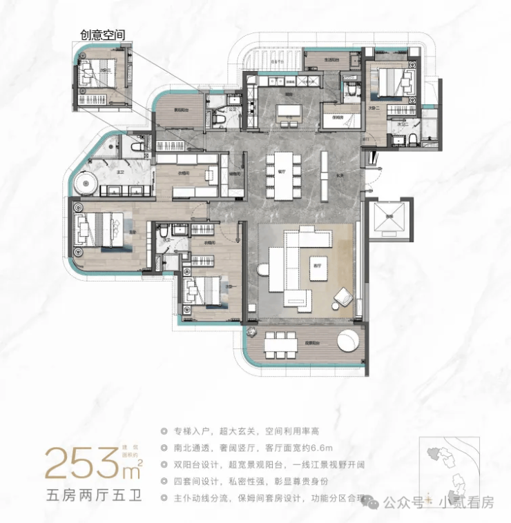 目前楼王产品璇湾壹号面积段为184-255㎡的4至5房,瞰江面最高18.3米,最高270°观景面,临江约100米,户型图如下: