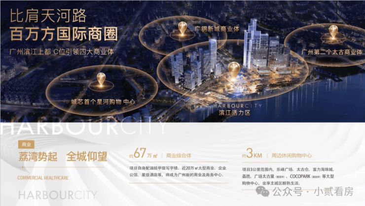 拥8大业态城市综合体,规划有大型商业,企业总部,星级酒店,滨江公园,文化艺术中心,教育医疗配套,高端居住及TOD立体交通于一体,广州唯一最全配套大体量的综合体。