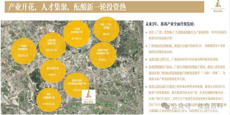 企业——周边集聚番禺大道科技动漫产业带、石基制造业产业圈、沙湾珠宝文旅产业圈、番禺大道北汽车服务产业带等10个知名产业圈,上百万精英人口,成就城市发展新增长极。