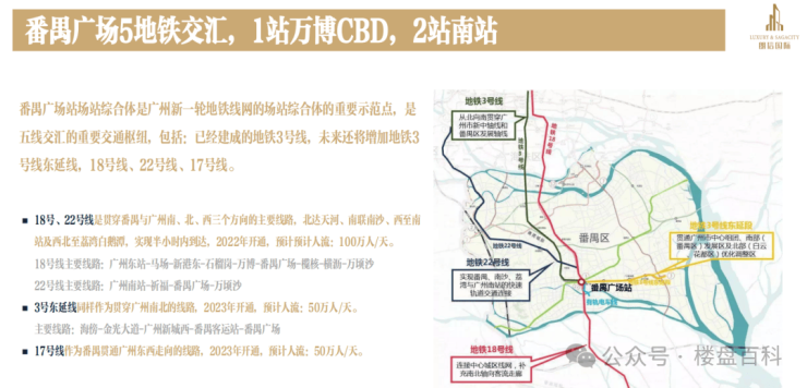 地铁——广州地铁3号线、17号线、18号线、22号线的番禺广场站附近,其中17/18/22线时速达160公里,为目前国内在建地铁时速最快,可实现1站万博,2站南站,5站天河,快速抵达珠江新城、广州东站、琶洲、万博、白鹅潭等中心商务区;