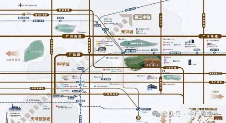 项目距地铁21号线中新站仅约500米,通过家门口的21号线,便可实现1站镇龙TOD、4站天河。而镇龙TOD,又可进一步握手“3地铁+1城轨+5高速”的超级路网,通过14号线可快速畅连黄埔、白云核芯区;搭乘新白广城轨,2站可达新塘,从知识城出发,到达白云机场仅3站,连接穗莞深城际直达深圳机场,快意纵横大湾区。