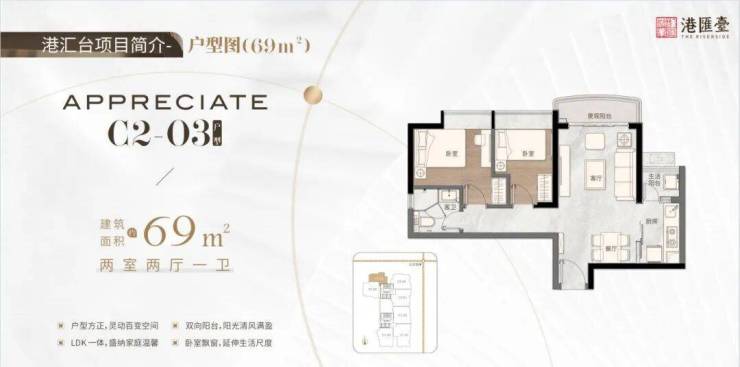 69㎡两房两厅一卫:户型方正,灵动百变空间,双向阳台,阳光清风,视野开阔。🏢 广州汉国置业港汇台【售楼处认证电话】🎥:400-856-3771(已认证)⭕