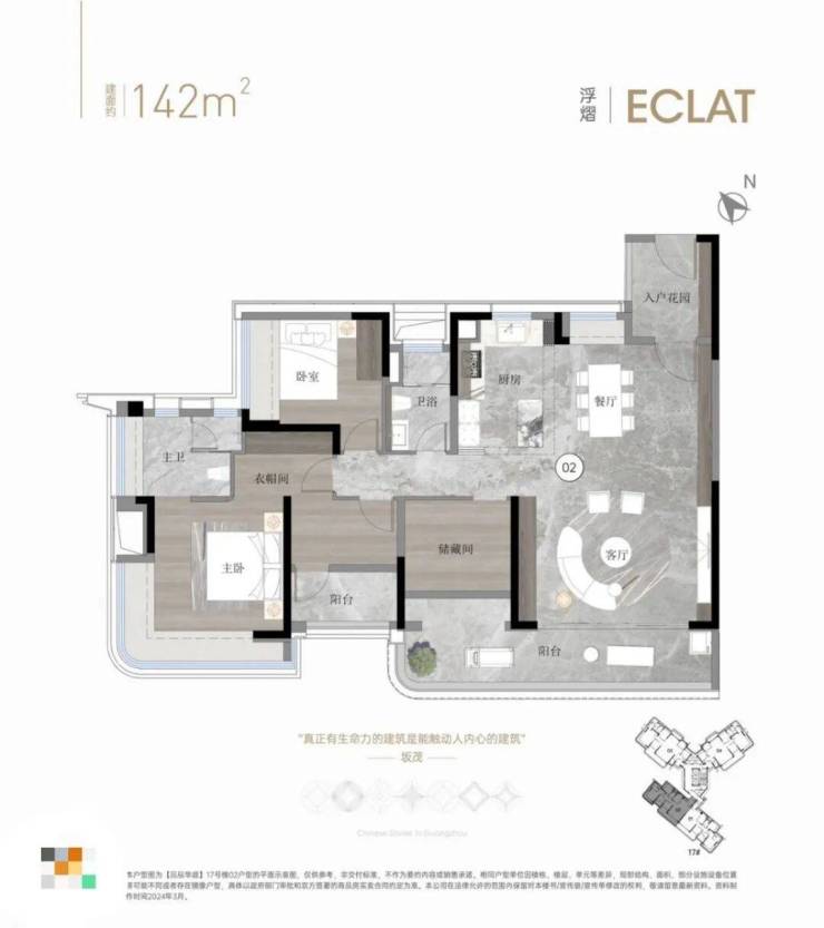 230平户型拥有私家电梯厅、双主套、独立佣人房、南北对流、LDKB大方厅、主卧L型270°飘窗等,大大提升了整体的空间体验。