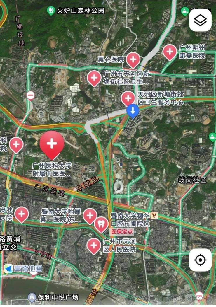 周边3公里内有蕙心医院、广州医科大学附属中医院、黄村医院、武警医院、中大附属岭南医院,广州附大肿瘤医院。