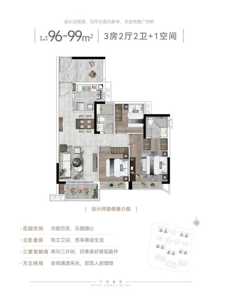 建面96平3+1房,户型动静分离,格局方正,三开间正南向,多一房可用于茶室、娱乐室、书房多功能使用
