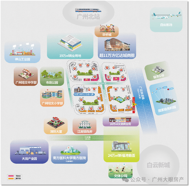 双向十车道广花快速路,无红绿灯、10分钟直达白云新城、3分钟高速口上环城高速、30分钟到珠江新城、2小时通达大湾区各大城市。