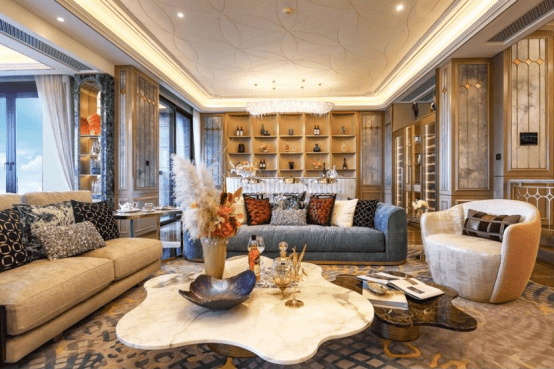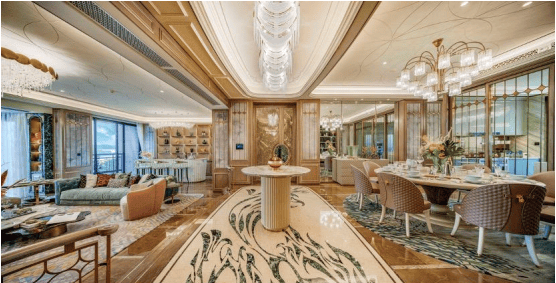 【超极休闲厅】270°外飘超极观景台,收纳志趣的雅集 十公里江城园无遮无挡一览无遗,大湾区唯此盛景; 超极水吧空间,背景柜设计成私人收藏展示区; 天空之境奢石吧台,配备全套控温酒柜;