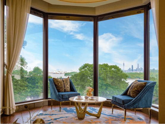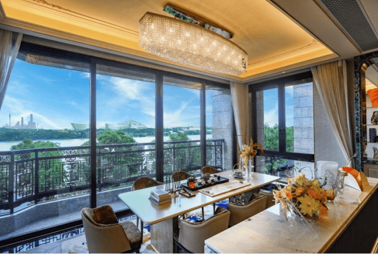 层高 3.57 米,厅堂宽达约 9.5 米,临江外飘的休闲厅宽达 5.8 米;