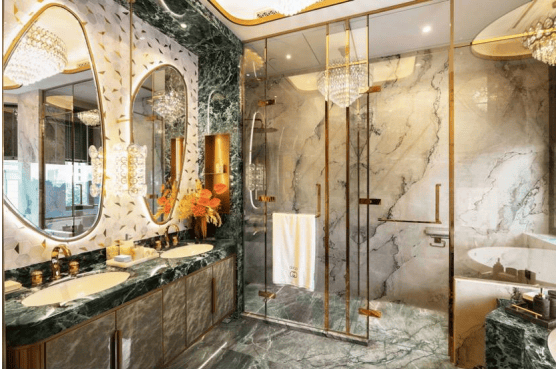 【世界级卫生间】为舒适高定 主背景墙设计前卫,采用大理石马赛克材质,搭配不规则的椭圆形清镜,时尚轻盈;全球严选奢石:缅甸亚马逊蓝、意大利芬迪灰、意大利普拉达绿; 世界名牌享受:德国 VilleroyBoch 洗手盆;法国 THG 龙头;意大利 HAFRO 按摩浴缸;意大利 GLASS 淋浴间;日本 TOTO 座厕;美国GRAFF五金配件; 数量上罕有、产品形态上的终极、品质上极致、空间上满足需求 不仅是家族成员休养生息的居所,还是家族传承的百年作品