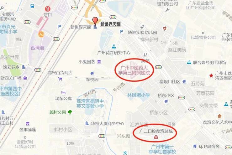 在小区西边200米就是广州中医药大学第三附属医院,往南边还有广二口腔荔湾总院,但是离的也不远,步行5分钟之内就能到达,另外还有三甲医院广州医科大学附属第一医院,广东省中医院芳村医院等等。。