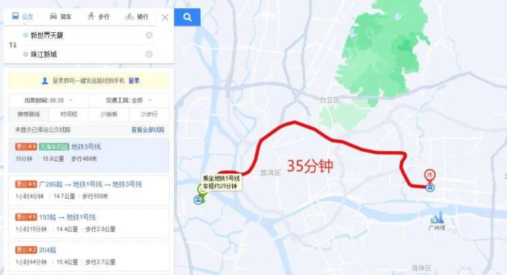 地铁去往珠江新城:步行至5号线滘口站,12个站直达珠江新城,无需换乘,耗时35分钟。