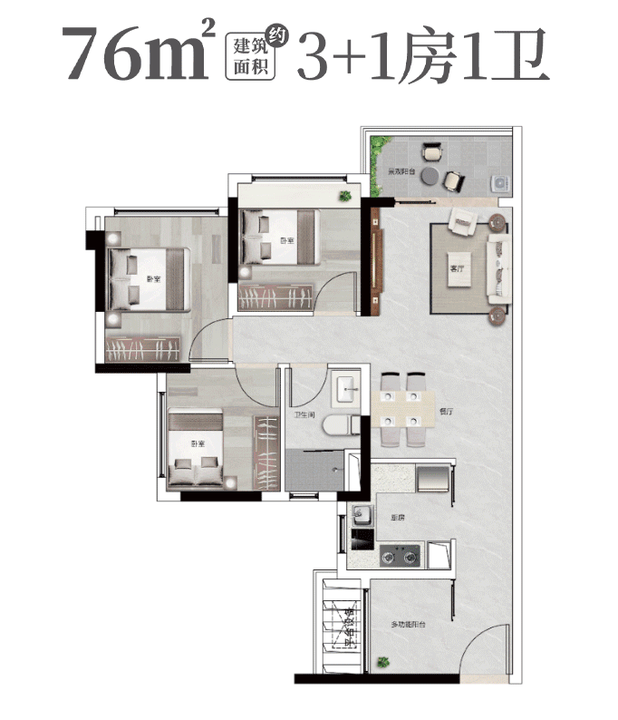 • 76㎡:3+1房设计,紧凑实用,总价310万起,适合刚需家庭。