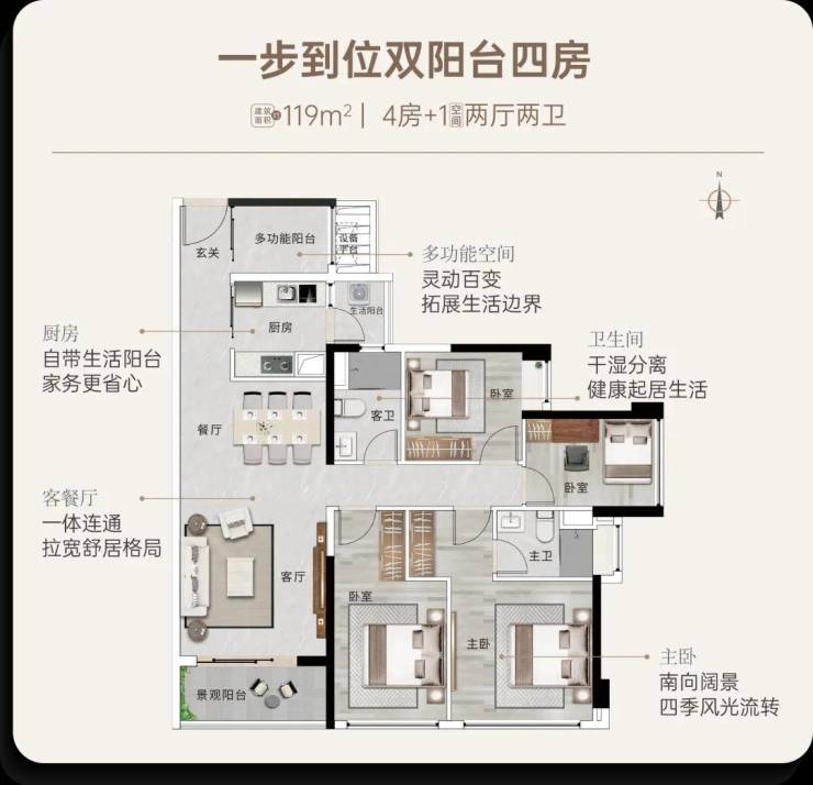 • 119㎡:4+1房,南向面宽15米,客餐厅一体化,总价530万起。
