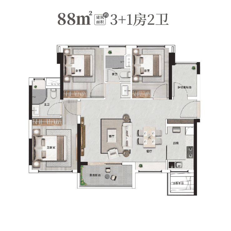 • 88㎡:竖厅与横厅双选择,主卧套房设计,南北通透,总价360万起。