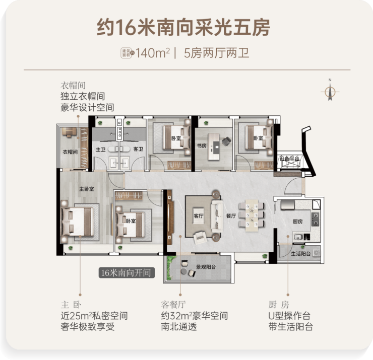 • 140㎡:5房布局,主卧带独立衣帽间,景观视野开阔,总价670万起。
