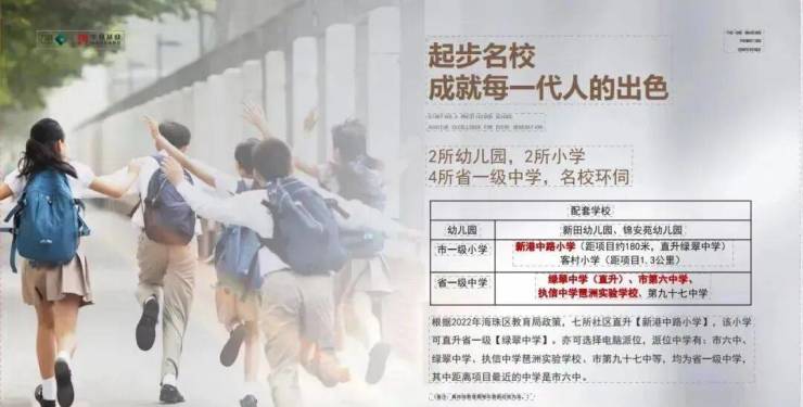 中学资源:涵盖省一级名校 —— 市六中、绿翠中学(新港中路小学可直升)、执信中学琶洲实验学校等,升学路径优质。