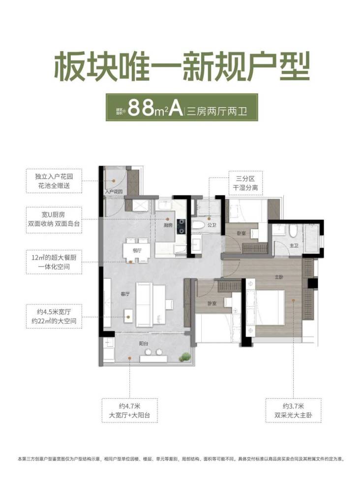 建面约88㎡A户型,三房两厅两卫,有约4.7米大阳台,以及约3.5*4.3米双采光大主卧。