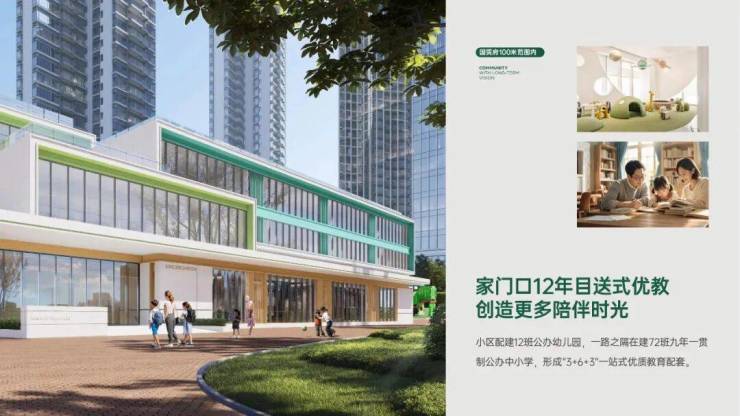 每一位家长都希望给孩子最好的,在孩子的成长过程中,教育更是重中之重。项目自身配建一所12班幼儿园,与一路之隔的一所九年一贯制公办学校(在建)形成“3+6+3”全龄教育链,总规模为72个班(小学48个班,初中24个班),分两期建设,近期已开工,预计2026年投用。