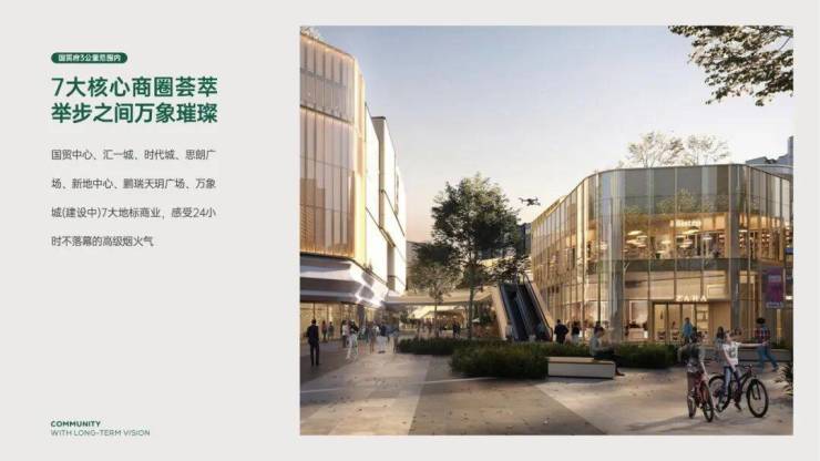 项目周边7大商圈环绕,三公里范围内,包含民盈国贸城、汇一城、时代城、思朗广场、新地中心、鹏瑞天玥广场(在建)、万象城(在建)7大地标商业,充分享受城市级烟火气。