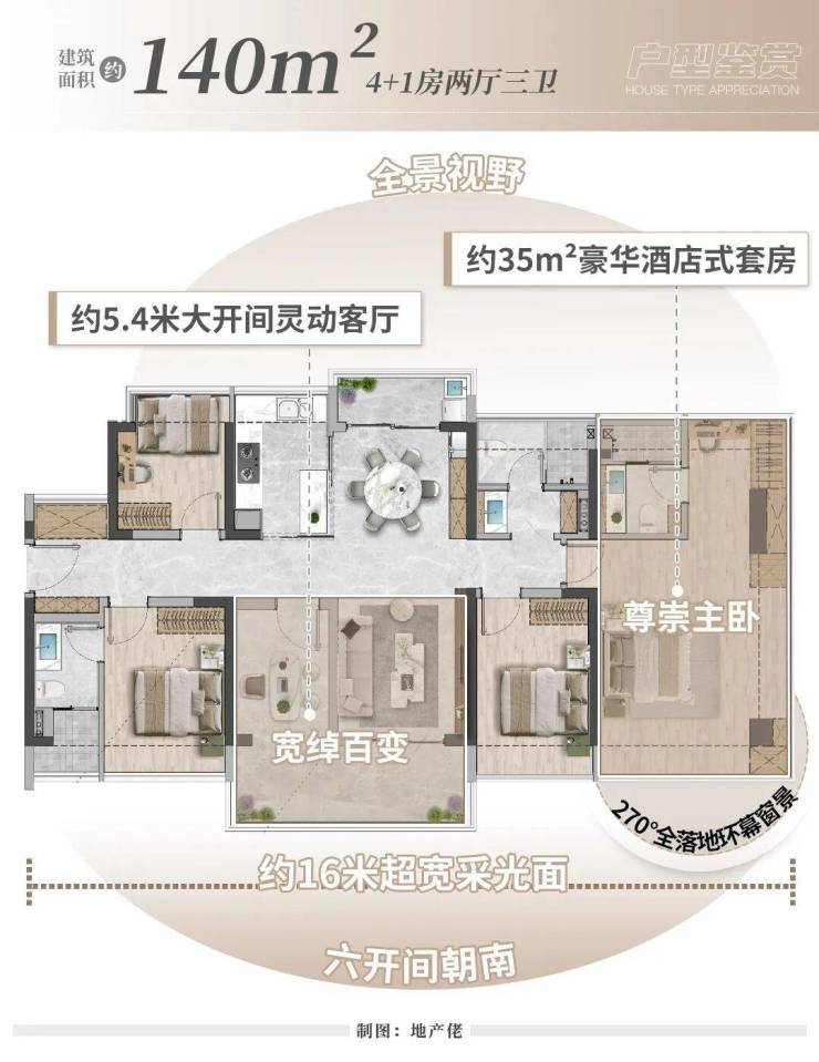 3、A户型——建面约140㎡4+1房两厅三卫,实用率超100%。