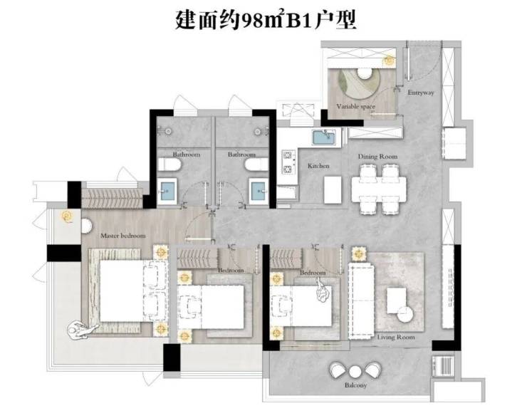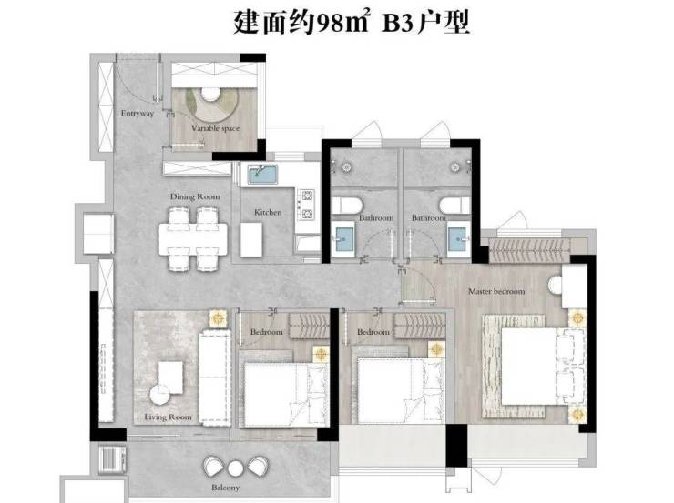 产品以主打刚需,有88㎡、98㎡、108㎡三至四房