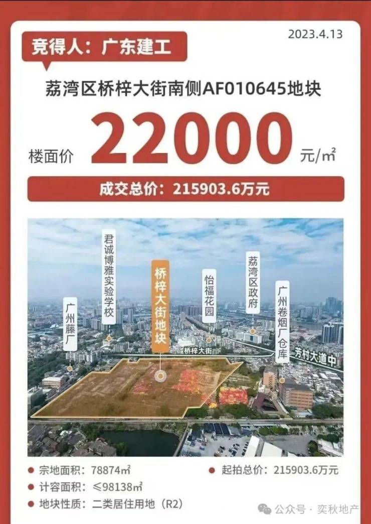 2023年4月,广东建工联合体以21.6亿底价竞得桥梓大街南侧地块,折合楼面价2.2万/平。