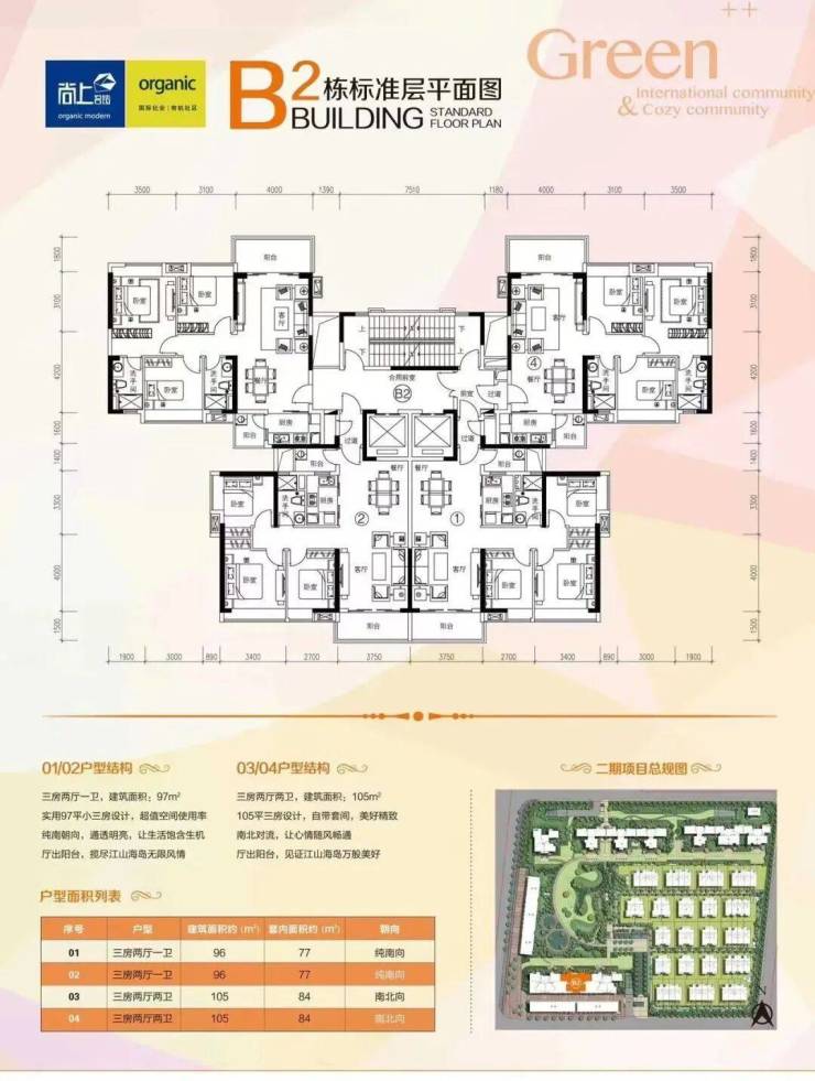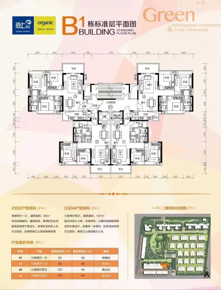 洋房【户型优点】:两梯四户、方正实用、高层、户户朝南