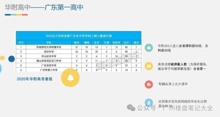 约300m增城一中、约500m合景自建36班公立小学、约500m公立华附中小学(华附中学为广东省高考重本率第一的学校、无双国士钟南山就是优秀校友代表之一)。