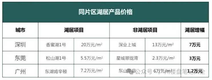 城市湖居极其珍稀,从广州的麓湖、深圳香蜜湖、东莞的松山湖来看,湖居都是富人住的地方,湖景房溢价比同区位其他住宅高出50%是十分常见的情况。