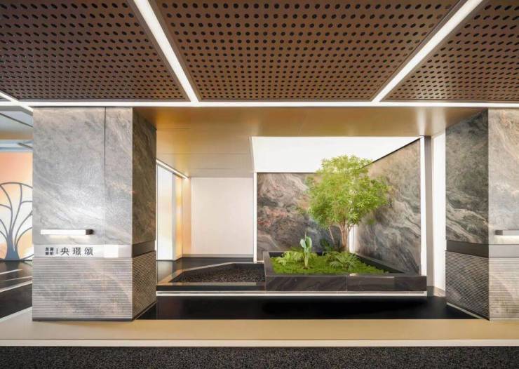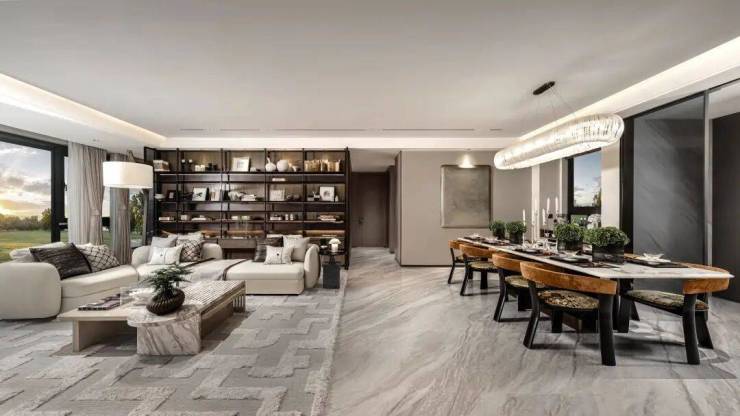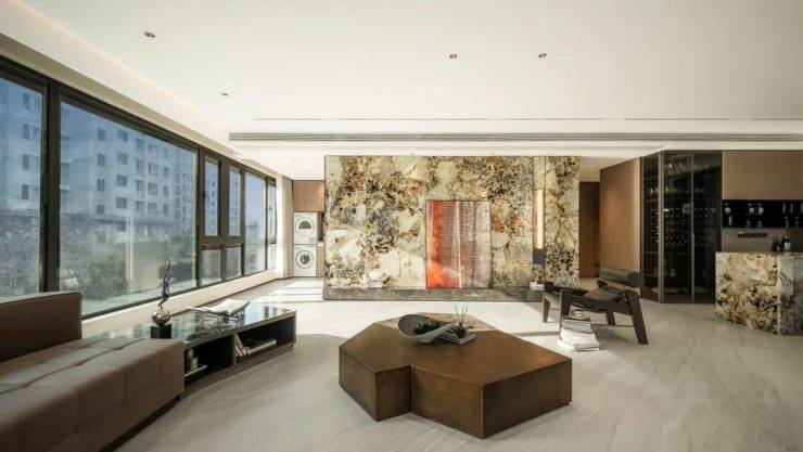 7⃣顶级装标:西门子厨房五件套,杜拉维特、汉斯格雅洁具,大面积石材、木纹墙板,0.9*1.8米连纹仿石砖密缝通铺、超大无界极薄无主灯悬浮吊顶
