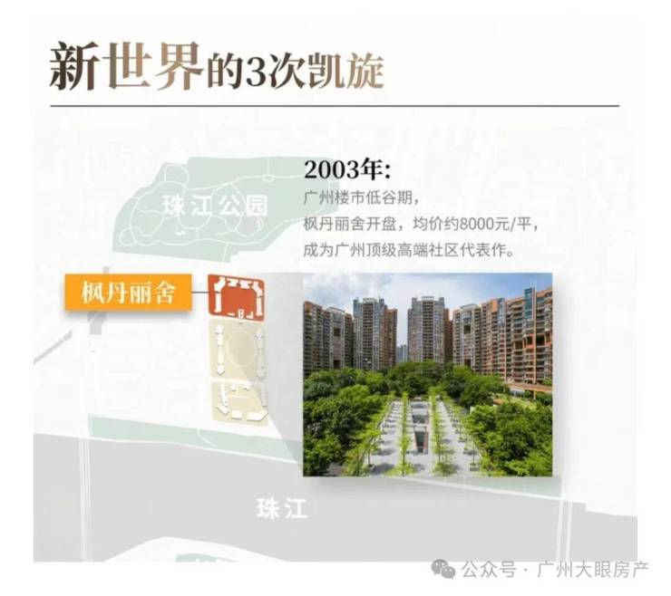 同年,凯旋新世界一期枫丹丽舍开盘,以约8000元/平的均价,成为广州顶级高端社区的代表作。